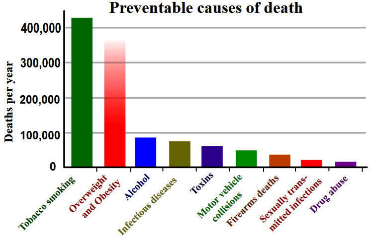 Together with the other leading causes of preventable deaths in the US—such as drugs and motor vehicle accidents—this means that about a million American lives are needlessly lost every single year, mostly from tobacco, followed by overeating and alcohol.