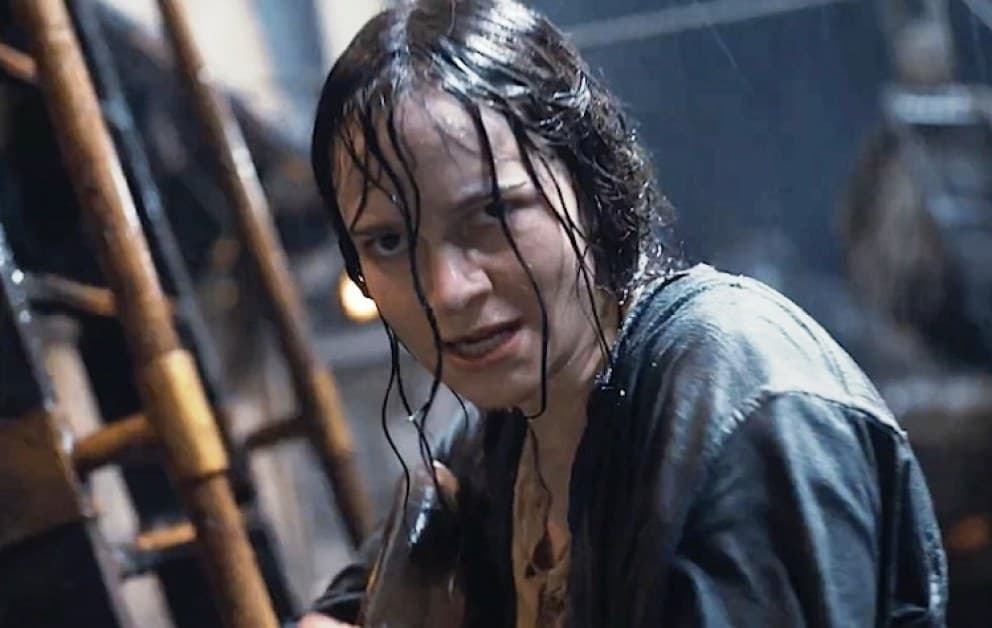 If Clemens gave the movie a totally unrealistic feel, it was the other, arguably real, hero — the only woman — who really got those eyes rolling. Anna is a young woman that Dracula brings on board to feed on. Once this peasant Romanian girl (who nonetheless speaks perfect English) escapes, she takes complete charge of the operation against the vampire. Whereas the rest of the crew — minus Clemens — panic and cannot for the life of them figure out what to do against Dracula, this calm and collected woman (pictured above during one of her heroic exploits) puts it all together.